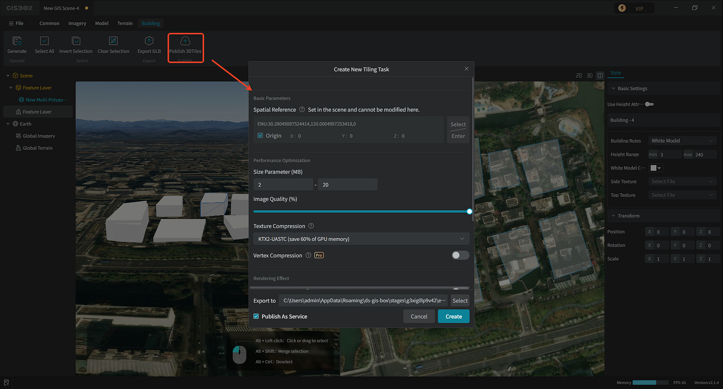 5. After completion, the building model can be published as a 3DTiles. For detailed steps, please refer to the previous article on one-click building generation and publishing as a service using SHP.