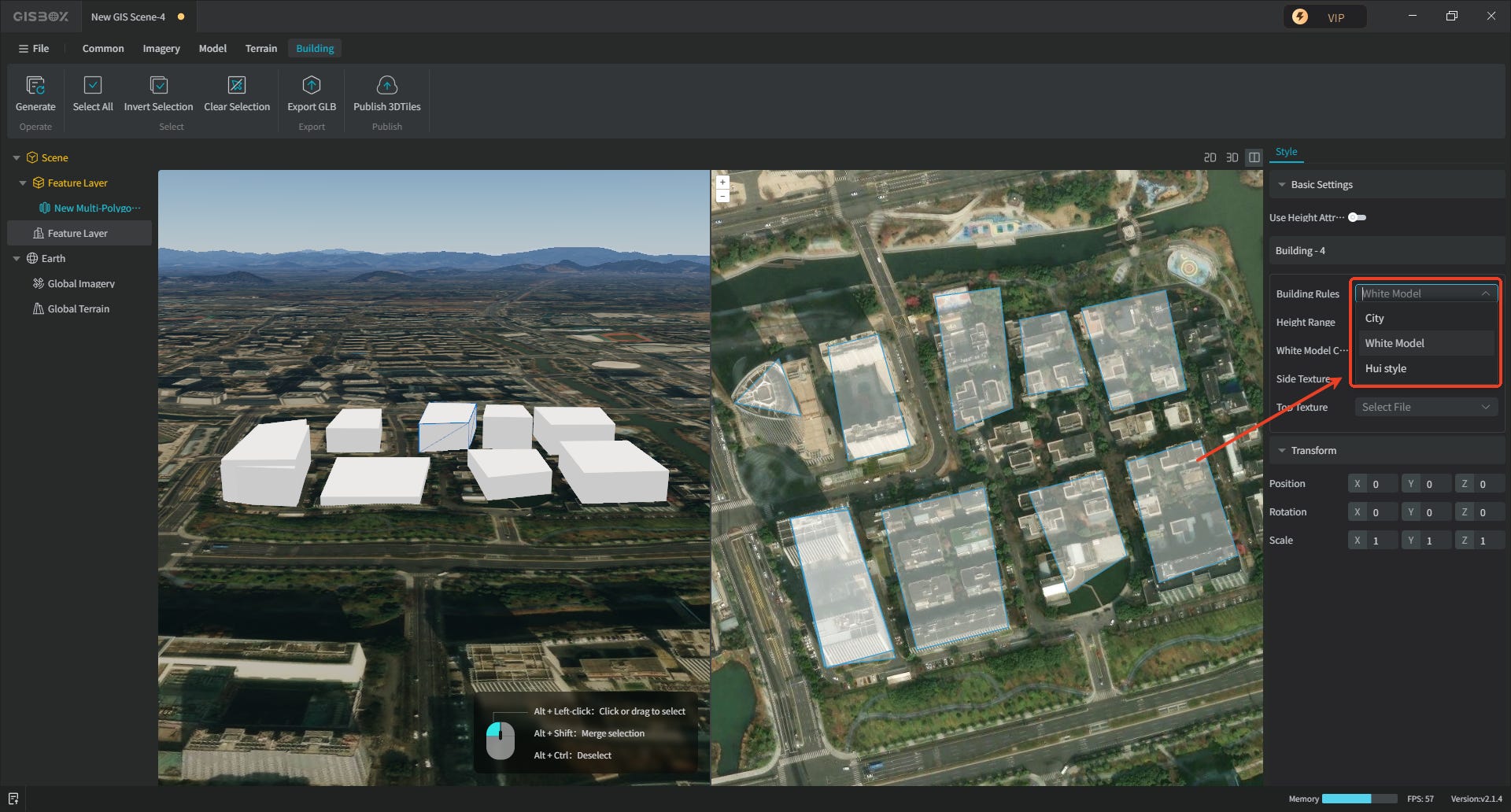 4. After editing, you can see the vector positions of the selected buildings. Clicking the “Generate Building” function in the upper left corner will instantly convert the selected vectors into a building model, which is clearly visible in the 3D view. It also supports changing the style of the generated building.