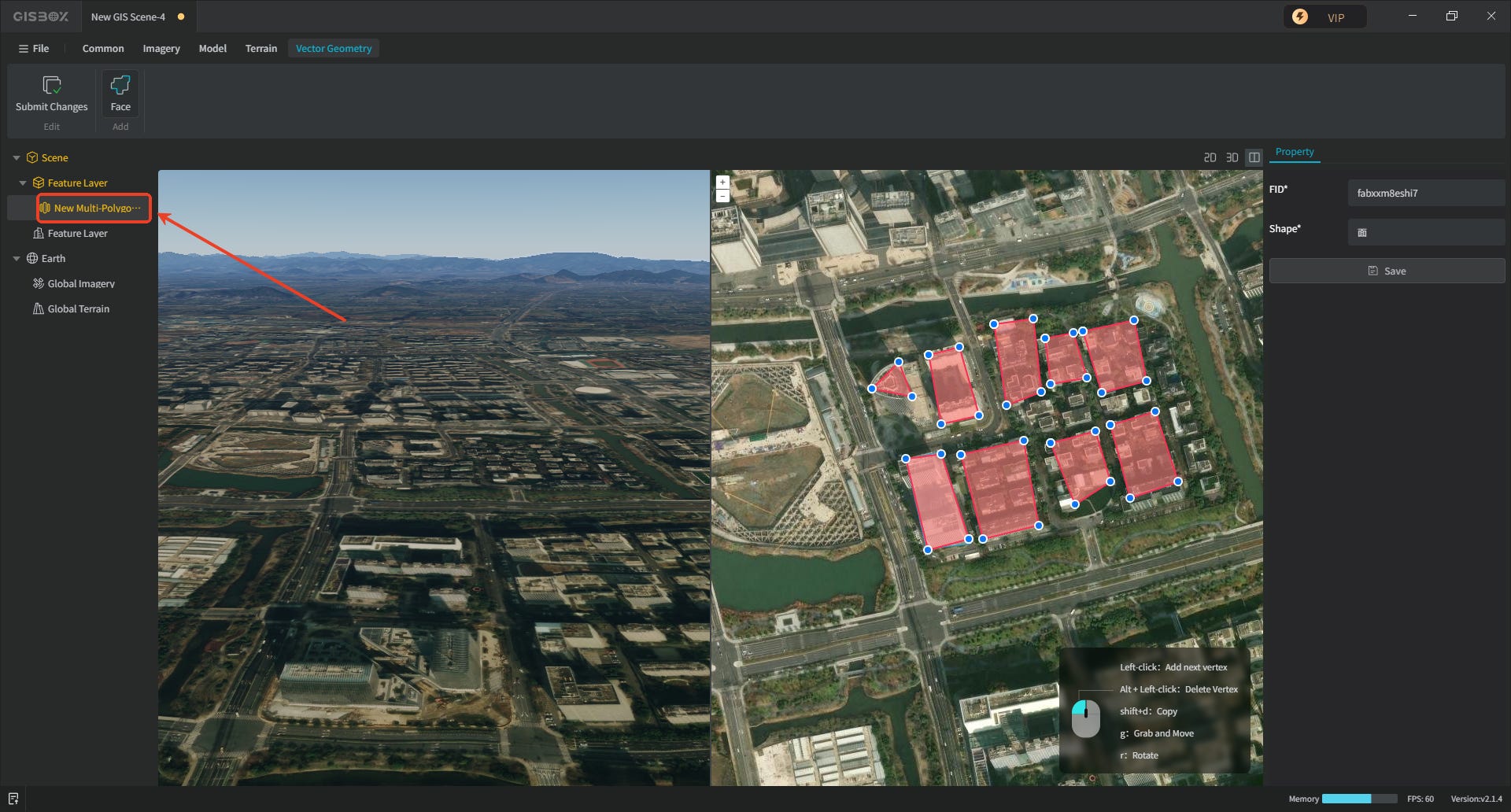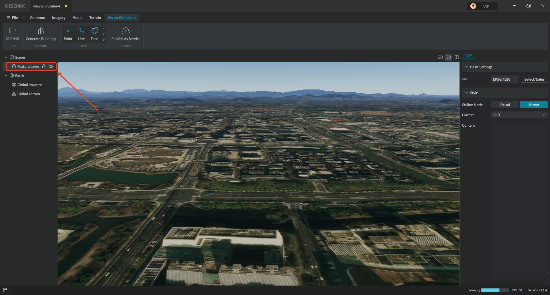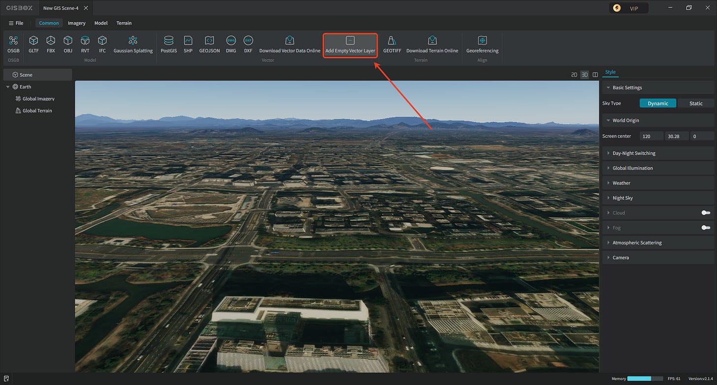 2. After the scene is successfully created, select “Insert Empty Vector” in the Tab bar at the top of the interface. A “Feature Layer” will then be added to the scene on the left.