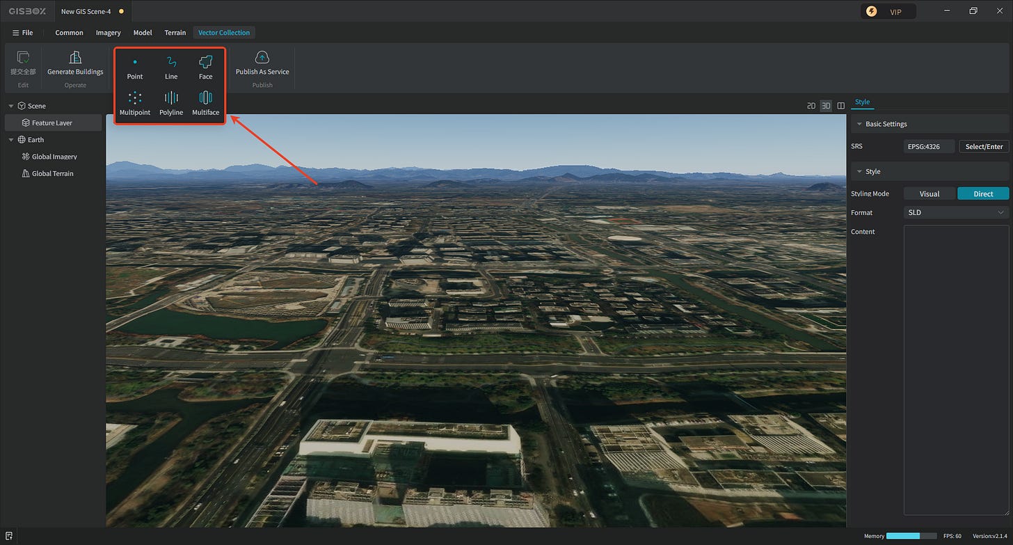 GISBox supports importing and editing vector data in its scene editor. Examples include PostGIS databases, SHP, GEOJSON, DWG, and DXF. It also supports downloading vector data from maps or directly inserting empty vectors for drawing in 2D. This article will guide you through inserting empty vectors into a scene and drawing vector data.