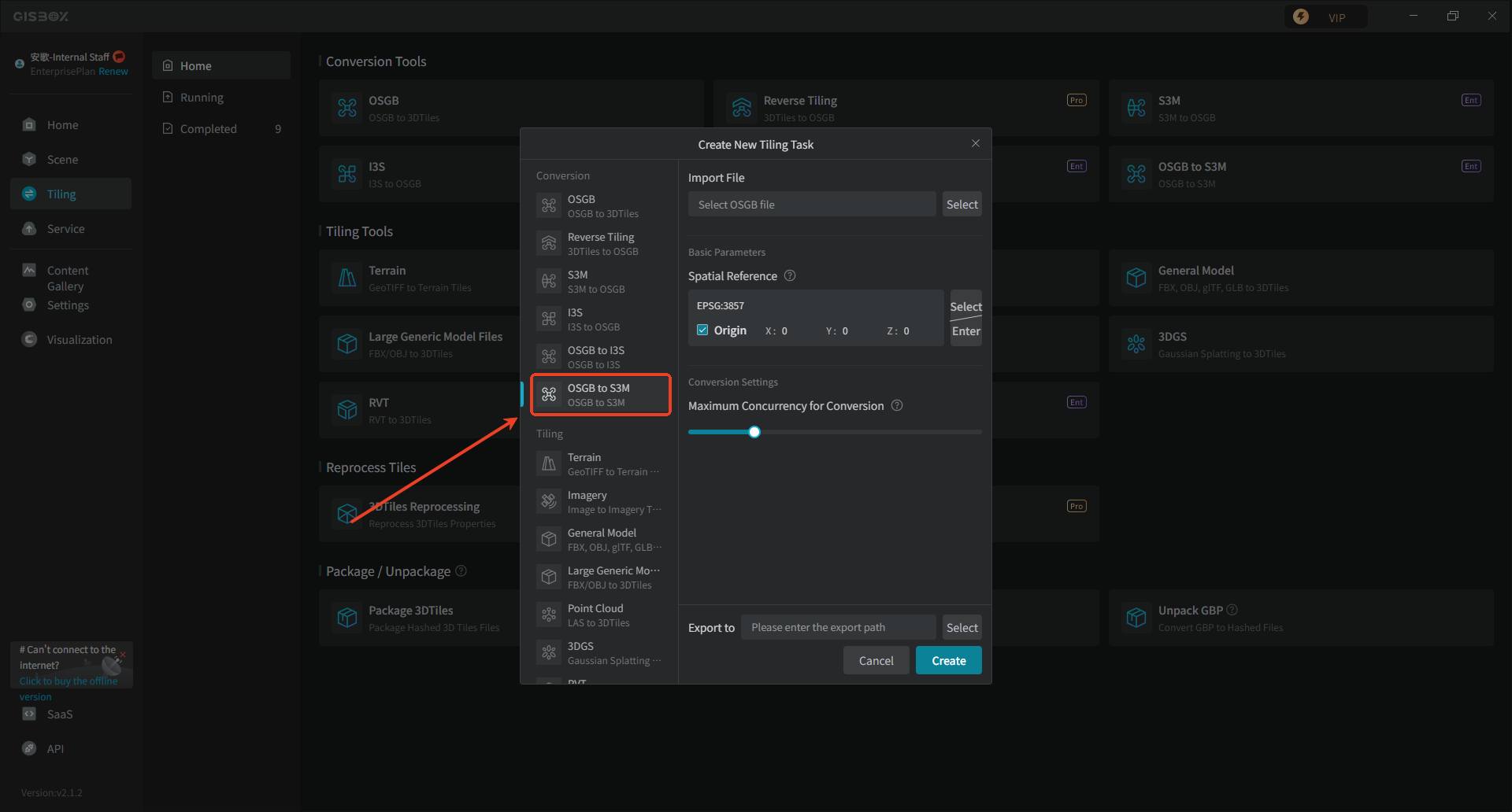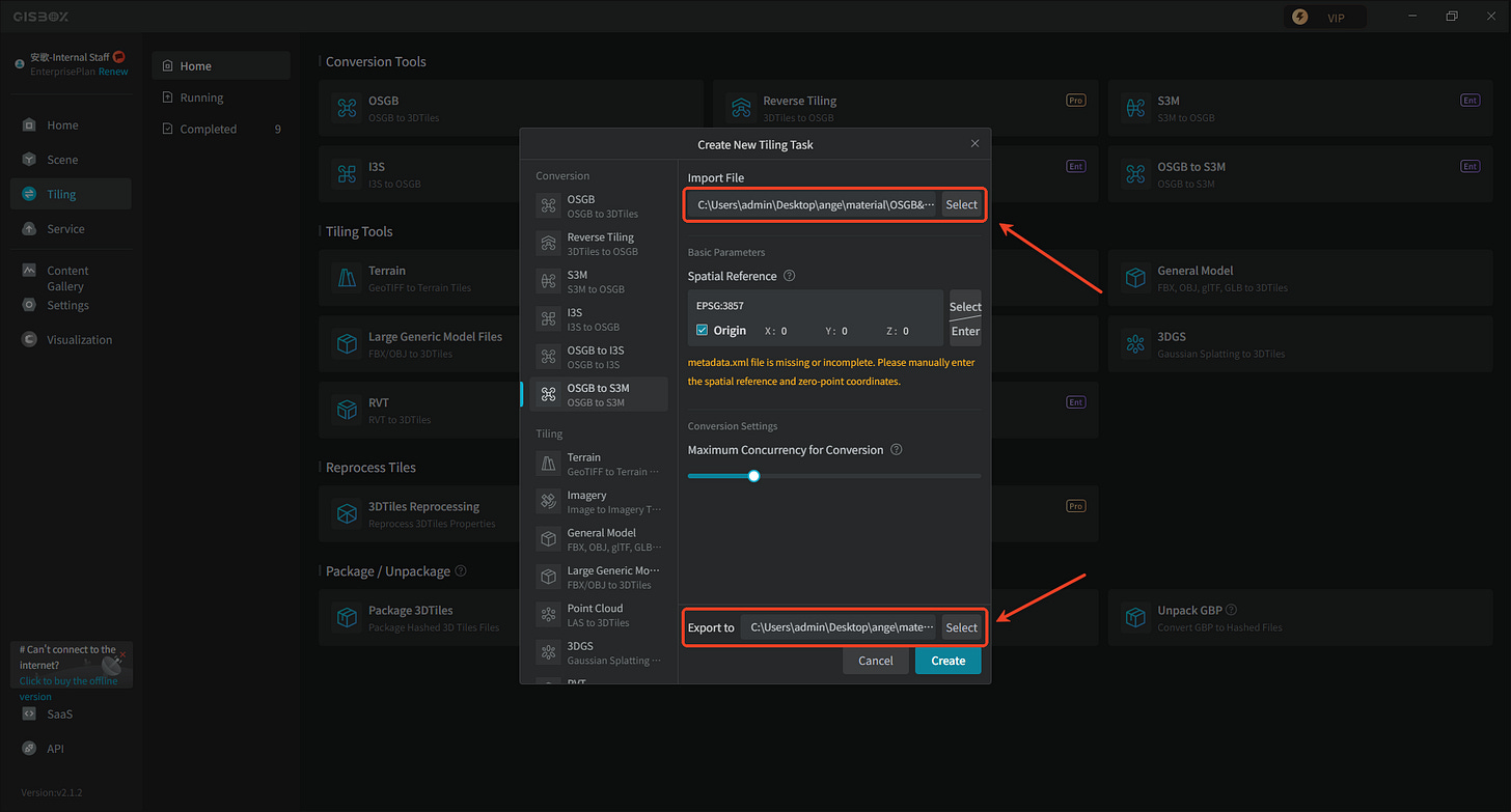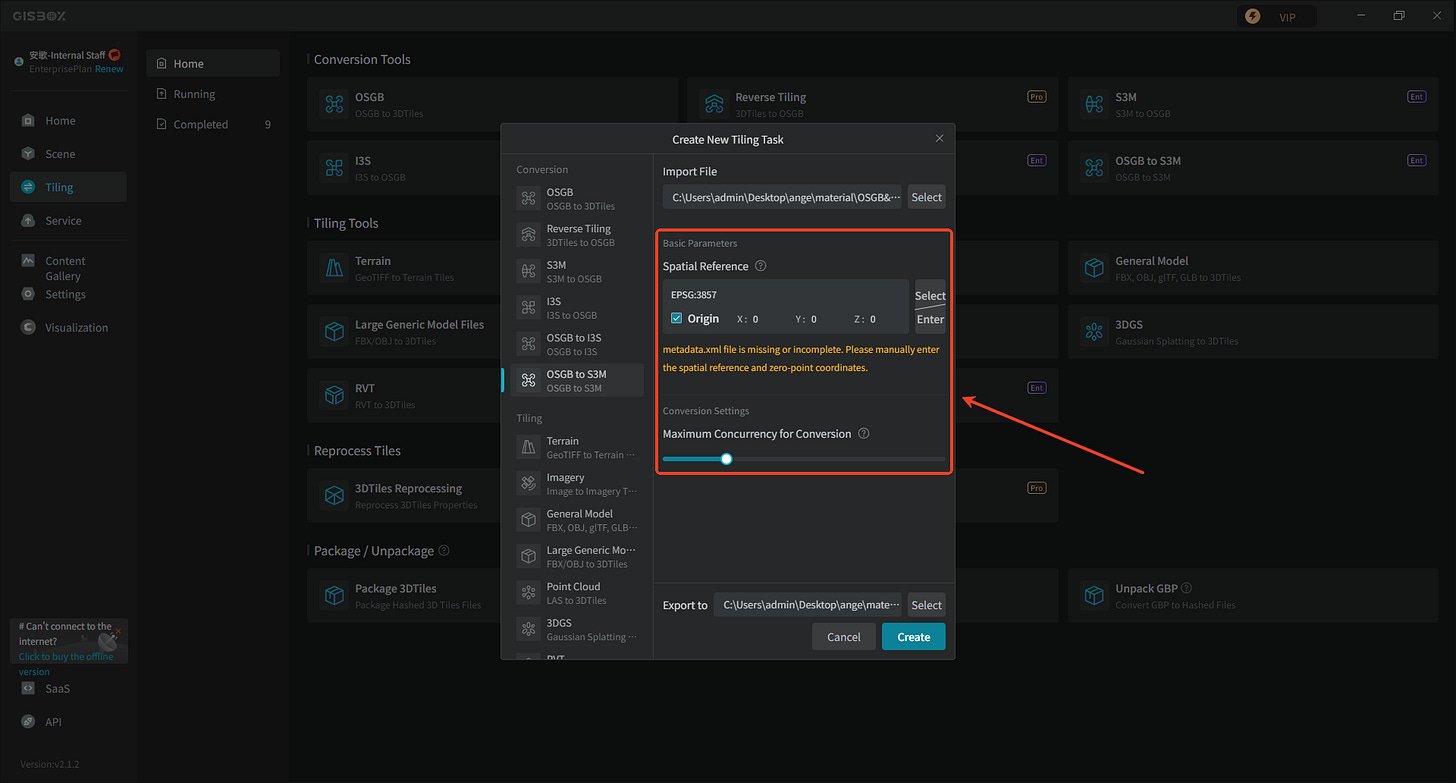 The “Spatial Reference” will be automatically recognized. If it fails to recognize, manual input is required. It is recommended not to change the “Maximum Concurrency for Conversion” If the conversion fails, reduce this value by half and retry. Once the task settings are complete, click “Create”